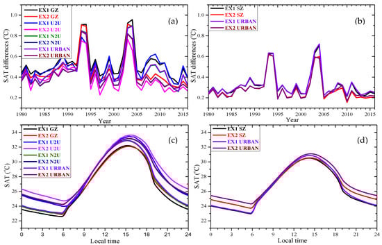 Differences in annual mean SAT and urban-related warming between T4 and Txn, and the corresponding trends, are further interpreted in Figure 8. The differences in annual mean SAT between T4 and Txn under EX1 are generally larger than those under EX2 over different subregions of Guangzhou, among which the values under EX1 and EX2 over the U2U areas are the largest, especially during periods with intense urban-surface-expansion between 2000 and 2016 (Figure 8a). These distributions result in a larger negative value for the trend differences between T4 and Txn over the U2U areas. The distances for annual mean SAT differences from T4 and Txn between EX1 and EX2 increase due to urban surface expansion, especially over the U2U areas of Guangzhou. The differences in annual mean SAT between T4 and Txn under EX1 are close to those under EX2 over different subregions of Shenzhen due to rapid urban surface expansion from a small village to a metropolis (Figure 8b). The differences in annual mean SAT calculated using T4 and Txn are attributed to nonlinear or asymmetric variations with time for the diurnal cycle of SAT [,]. The varied performance in the changes in annual mean SAT over different subregions is further expressed by urban-surface-expansion-induced changes in the diurnal cycle due to the asymmetric warming (Figure 8c,d).