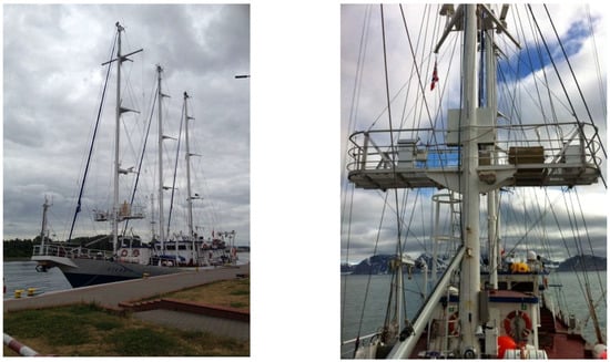 In order to monitor all the mentioned chemical markers in the Arctic, some important measuring sites are present, for example Ny-Ålesund, which is a fully equipped site in which several monitoring stations (e.g., Zeppelin is one of the most important ones) are present (more than 15 nations work there). However, even though it is particularly suitable for aerosol studies due to the long-term data series available (aerosol properties, lidar profiles, radiometric and meteorological data) [22,30,32,34,35,78,79], in summer this land-based site can be influenced by ship emissions [32], thus reducing the capability to observe pure summertime aerosol properties in the Arctic pristine environment. Moreover, local micrometeorology can play a serious role influencing the land-based measurements [32,80].