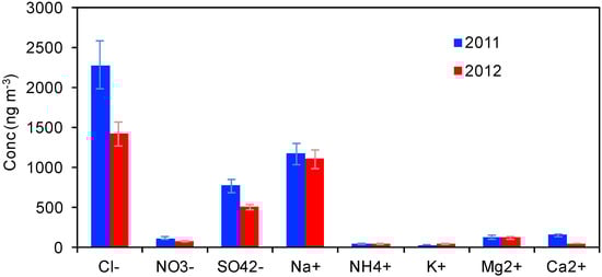 Na+, NH4+, K+, Mg2+, and Ca2+ cations and Cl−, NO3−, and SO42− anions were detected on the filter samples. Their concentrations during AREX2011 and AREX2012 are reported in Figure 4 (and summarized in Table 1).