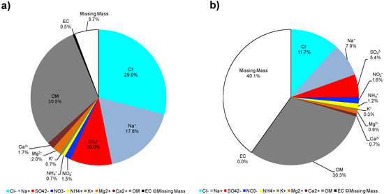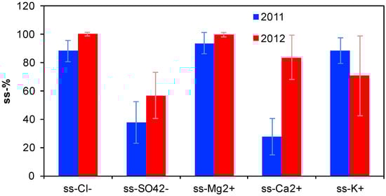where 1.47 is the mass ratio of the sum of Na+, K+, Mg2+, Ca2+, SO42−, and HCO3− to Na+ in sea water. This approach was followed as it presents the advantage to avoid the inclusion of non-sea-salt (nss-) K+, -Mg2+, -Ca2+, and -SO42−, and allows, at the same time, to consider the loss of Cl− due to the Cl− depletion processes [97,98]. Finally, the sea salt contribution to the observed concentrations of K+, Mg2+, Ca2+, Cl−, and SO42− were determined following Mihalopoulos et al. [99]: