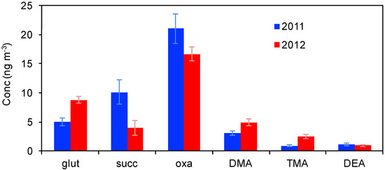 Concentrations of organic ions during AREX2011 and AREX2012: glutaric (glut), succinic acids (succ), oxalic acid (oxa), dimethylamine (DMA), trimethylamine (TMA), and diethylamine (DEA).