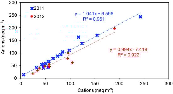 Finally, aerosol acidity was estimated from the whole water-soluble composition by correlating the anion and cation charges in terms of equivalents (Figure 7). Results were characterized by good linear correlations (R2 = 0.961 and R2 = 0.922 during AREX2011 and AREX2012, respectively) with slopes close to one (1.041 and 0.994 during AREX2011 and AREX2012, respectively). These data highlight that the collected aerosol samples were close to neutrality.