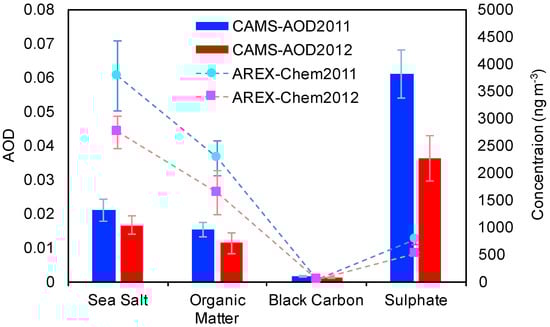 Finally, the Copernicus Atmosphere Monitoring Service (CAMS) [92] was used to obtain the aerosol optical depth (AOD), in terms of aerosol species, in order to compare them with the experimental chemical composition determined close to sea surface. This was done with the aim: (1) to verify if the interannual variation of the columnar optical properties was in agreement with chemical composition measured at ground, and (2) to highlight any difference between ground-base and columnar data in terms of relative contribution of each aerosol species to the total, in order to highlight the need of vertical aerosol profiles over the open Arctic Ocean.