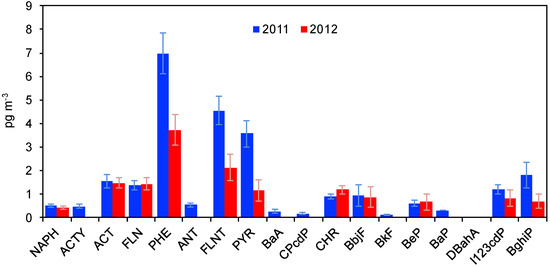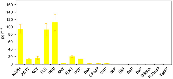 For the purpose of PAH determination, the injector was kept at 280 °C and the temperature program was from 80 °C to 330 °C. The transfer line was kept at 310 °C. Nineteen PAHs were determined in SIM mode by monitoring the mass/charge m/z corresponding to their molecular weight: naphthalene (NAPH), acenaphthylene (ACTY), acenaphthene (ACT), fluorene (FLN), phenanthrene (PHE), anthracene (ANT), fluoranthene (FLNT), pyrene (PYR), benzo[a]anthracene (BaA), ciclopenta[cd]pyrene (CPP), chrysene (CHR), benzo[b]fluoranthene (BbF), benzo[j]fluoranthene (BjF), benzo[k]fluoranthene (BkF), benzo[e]pyrene (BeP), benzo[a]pyrene (BaP), dibenzo[a,h]anthracene (DBahA), indeno[1,2,3-cd]pyrene (IcdP), and benzo[ghi]perylene (BghiP). It should be pointed out here that benzo[b]fluoranthene and benzo[j]fluoranthene co-eluted and they were determined together (BbjF). The average recoveries of deuterated PAHs spikes onto the filters were 37 ± 5% for acenaphthene-d10, 58 ± 7% for phenanthrene-d10, and >60% for the other deuterated standards. The PAH recoveries from the particulate matter were determined by analyzing three aliquots of standard reference material (SRM 1649a; NIST, Gaithersburg, MD, USA).