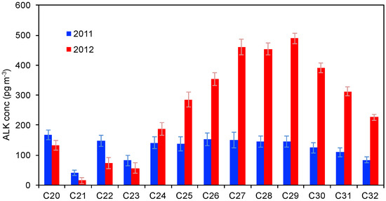 When the OC was converted to OM (using a factor of 2.1 in remote Arctic regions [32]) the values increased up to 2265 ± 315 and 1631 ± 400 ng m−3 during 2011 and 2012, respectively.