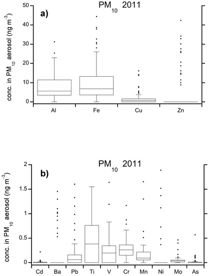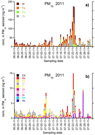 Higher OM and EC during 2011 are in agreement with the results and chemical markers reported in the previous Section 3.1 and with back trajectories in Supplementary Material (Figures S1 and S2).