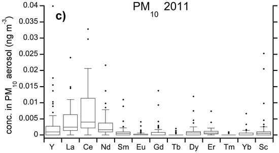 Trace elements, including rare earth elements (REEs) were also measured using a high resolution ICP-MS (Inductively Coupled Plasma-Mass Spectrometer) technique on PTFE aerosol samples (PM10) collected during AREX 2011 cruise at a 12 h resolution. The analytical determinations were carried out using an ELEMENT2 (Thermo Fisher Scientific, Waltham MA, USA) system consisting of a double focusing magnetic sector field inductively coupled plasma mass spectrometer (ICP-SF-MS) equipped with a reverse Nier-Johnson geometry and coupled with a desolvation system provided with a microflow nebulizer. The use of a mass spectrometer detector was pivotal in order to measure accurately very low concentration levels [77].