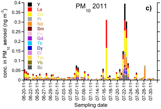 Other chemical components can be very important in the Arctic too, such as trace elements, including rare earth elements (REEs). Despite their low concentrations (with respect to other markers), they can provide relevant information about the source areas of the studied atmospheric aerosols thanks to their conservative character [71,72,73]. In fact, they usually keep the same original composition during the transport from the source area to the sampling site, even when they are transported for thousands of kilometers [74]. Thus, selected elements and their ratios can be taken as specific tracers of natural and anthropic sources. REEs are particularly suitable for this purpose. Given the analytical limitations in their measurements (very low concentrations), trace elements and REEs data available from remote sites are limited to short or low temporal resolution sampling campaigns [75] or to a few continuous campaigns in the High Canadian Arctic [76] or Svalbard Islands [77]. Hence, the data set here presented from the Arctic Ocean offer a chance to enlarge the currently available information of these chemical tracers in polar areas.