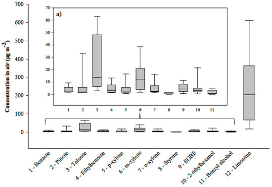 All the other compounds were found at concentration levels one or two orders of magnitude lower than d-limonene, and ranged from 3.2–63.1 µg/m3 (toluene), 1.7–38.6 µg/m3 (m-xylene) to <LOD-5.0 µg/m3 (benzyl alcohol) and <LOD-1.5 µg/m3 (styrene). Benzene, ethylbenzene, o-, p-xylene, EGBE, 2-ethylhexanol, and α-pinene showed comparable values, with average concentrations between 4.0 and 6.0 µg/m3 (Table 4).
