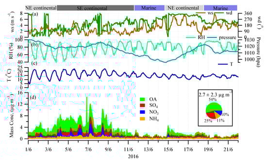 Average diurnal cycles of OA, sulfate, nitrate, and ammonium over the three periods in different air masses are shown in Figure 2. OA was flat throughout the day, with a slight increase in the midday and in the evening in southeast (SE) continental air masses (Figure 2a), indicating that the measurement site was not influenced by any strong local emission. OA remained at the level of around 2.7 μg m−3, more than 2 times higher than other species. Sulfate and ammonium showed a similar pattern, with no obvious trend. However, nitrate presented in relatively higher concentrations during the night (with a maximum at 5:00 am, local time) and lower concentrations during the day (with a minimum at 16:00), suggesting strong influences from evaporative loss and gas–aerosol partitioning. As discussed in Section 3.4, the major source of nitrate was from regional transport. Therefore, the diurnal variation of nitrate was driven solely by evaporative loss and gas-to-particle partitioning. In northeast (NE) continental air masses, none of the NR-PM1 species showed any obvious trend and all were relatively flat except for OA, which showed a slight drop in the evening (Figure 2b). The concentrations of NR-PM1 species were 1.6–3.6 times lower in NE continental air masses than in SE continental air masses. In marine air masses, all the NR-PM1 concentrations were the lowest among the three studied periods (Figure 2c). OA and sulfate showed a similar trend, with an increase from ~13:00 until 20:00, indicating a similar source or an aging process.