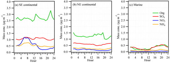 The diurnal variation of NR-PM1 species (OA, sulfate, nitrate, and ammonium) over the period influenced by (a) SE continental; (b) NE continental; and (c) marine air masses.