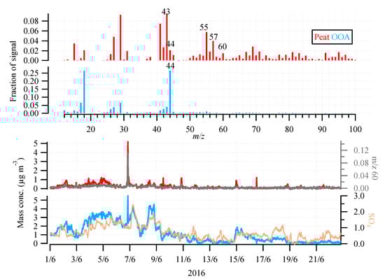 Figure 3 shows the mass spectra and temporal variations of peat and oxygenated OA (OOA) at an a value of 0.1. Peat was classified as primary OA and was associated with peat burning activities. The peat profile shows prominent peaks at mass to charge ratios (m/z) 41, 43, 55, and 57, characteristic of aliphatic hydrocarbons. It was also characterized by higher contribution at m/z 60 compared to traffic-related hydrocarbon-like OA factor (known as HOA). m/z 60 was associated with fragments of sugars, such as levoglucosan, which is produced by cellulose pyrolysis []. The time series of peat correlates well with that m/z 60 (R = 0.81). Most of the time, peat factor shows low concentrations (< 0.2 μg m−3) but with few pollution spikes (> 1 μg m−3) observed during the evening. As shown in Figure 1c, the temperature during summer in Galway could drop below 10 °C during the evening, so it is likely that some peat burning could occur during these cold summer evenings. On the other hand, the profile of OOA shows a high f44, arising mainly from CO2+, which is associated with aerosol aging or secondary formation. The time series of OOA shows a good correlation with sulfate (R = 0.83), pointing to secondary and/or regional sources.