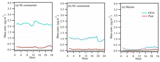 The average diurnal cycles of peat and OOA factors over the three periods in different air masses are presented in Figure 4. In the three studied periods, OOA showed a dominant contribution over peat factor, on average accounting for ~84% (or 1.0–2.2 μg m−3) of the total OA in the continental air masses (Table 1) and 72% (or 0.2 μg m−3) in the marine air masses, suggesting the strong influence of secondary formation. The strong influence of secondary formation on urban PM levels have also been reported in summer in Paris [] and London [], where ~50% of the total OA was found to be OOA in both cities. As will be discussed in Section 3.4, France and the UK were potential geographic origins of the secondary aerosol observed in Galway. The higher OOA fraction in Galway than in London or Paris suggests an aging process during long-range transport. In addition, peat burning accounted for a minor fraction of the total OA (16–28%, or 0.09–0.4 μg m−3) of the total OA, suggesting a relatively low influence from local sources. As shown in Figure 1a, peat had an increased concentration during the evening (at ~22:00, local time) which was mainly associated with emissions from domestic heating activities coupled with the shallower planetary boundary layer in the evening. In addition, a slight peak at noon (at ~13:00) was also observed, which might be due to emission from peat burning for barbecues.