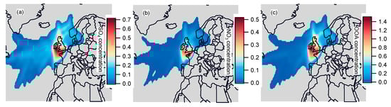 The concentration-weighted trajectory (CWT) approach was used to investigate the potential transport of pollution [] on the interface of ZeFir []. CWT couples concentration data with air mass history to identify potential source regions that may be responsible for high concentrations observed at the receptor site. A weighing function was added to the CWT calculation to down-weight cells associated with a low count of trajectory endpoints. The setup of the different weights is empirical, and our setup followed the recommendation of Petit et al., []. The weighing function was based on the trajectory density; the weighing coefficients were relative to the maximum of this density.