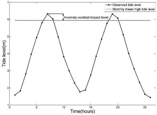 Here we need to acquire the impact level caused by storm surge in coastal areas. Surge is a generalized definition of TC-induced anomaly sea level fluctuation, which is usually quantified by three intensity indexes: maximum high water level, nontidal residual, and skew surge. The calculation function of these indexes considers the general storm surge-induced water level rise. However, because of the limits of calculation function, they cannot directly show the impacts of storm surge-induced water level rise. Therefore, we defined ‘anomaly nontidal impact level’ at each tide-gauge station during TC landfall period for the analysis of storm surge effects on coastal area. An anomaly nontidal impact level at TC landfall day is the difference between the maximum tide level within a tide cycle recorded by the tide-gauge stations at the day that TC landfall and the monthly mean astronomical high tide level (see Figure 1). Positive surge events are added to tidal levels, increasing the risk of coastal flooding by extreme water levels []. The observed sea level variation is considered as the sum of a mean sea level, an astronomical tidal component and a nontidal residual []. The monthly mean high tide level refers to the calendar month when the TC made landfall. It is the combination of astronomical tidal component, the mean sea level, and other influencing components. If the storm surge-induced tide level was higher than the monthly mean high tide level, it would cause more damage than if the tide level was not lower than average high tide level. In present work, we focus on the storm surge threat and positive storm surge activities. Therefore, this extraction method of anomaly nontidal impact level eliminates local coastal topography influence and mean sea level change from storm surge-induced water level fluctuations. It can directly indicate the characteristics of elevated water level caused by storm surge. In the present study, we calculate anomaly nontidal impact level within a tide cycle and select the data above zero for one day (can obtain one or two data, even no data). The data selection needs to take TC tracks into consideration. In general, during a TC landfall period, we chose three or four days of anomaly nontidal impact level, which refer to the landfall day and the day before and after landfall day (or the days TC stalled near coastline).