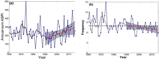 Time series of (a) annual-sum ASPI, (b) frequency of landfall TCs along the southeastern coastline of China from 1960 to 2015, derived from Japan Meteorological Agency (JMA). Thick black lines are the 5-year running average with the red line schematically indicating trends. Shading shows 95% confidence bounds. Dotted black line in (b) is the average frequency of landfall TCs.