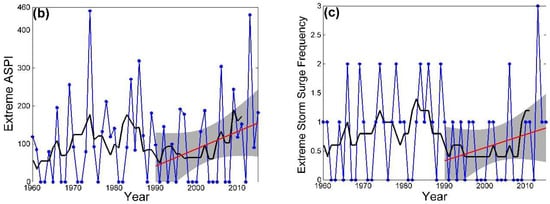 In conclusion, the frequency of landfall TCs was low. On the contrary, the annual-sum ASPI was inconsistent with frequency, showing a significant increasing trend at the same time. The annual-sum ASPI showed that storm surge potential impact had a significant increasing trend with an increasing rate over 20% over the past 15 years. This was not caused by the increasing frequency of landfall TCs in recent decades. Meanwhile, the annual mean value of ASPI per TC increased by over 19%. The annual-sum ASPI of extreme storm surges did not exhibit the same upward trend in the late 1990s, but a significant upswing occurred around 2006. As discussed above, the increasing trend of storm surge potential impact was mainly due to the greater threat of general storm surge (stronger normal storm surges) since the mid-1990s. However, the pronounced increasing trend of storm surge potential impact from the late 2000s was caused by extreme storm surge activities. Both the frequency and intensity of extreme storm surge activities showed significant increasing trend. This is consistent with the intensifying landfall of TCs over the northwest Pacific and the more frequent category 4–5 TCs in recent years [].