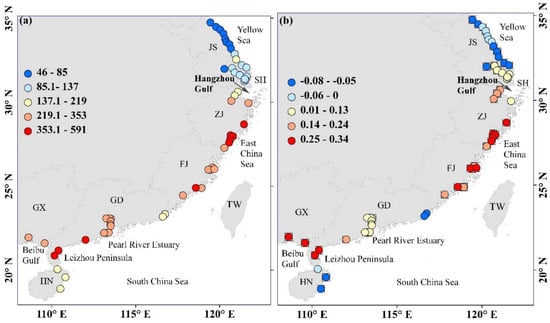 (a) Sum of ASPI in each tide-gauge station from 1960 to 2015. (b) ASPI trend of individual tide-gauge stations along the southeastern coastline of China from the 1990s. Square marks indicate that the p-value of the increasing rate is smaller than 0.05. The capital letters represent the names of the coastal provinces: JS—Jiangsu, SH—Shanghai, ZJ—Zhejiang, FJ—Fujian, TW—Taiwan, GD—Guangdong, GX—Guangxi, HN—Hainan.