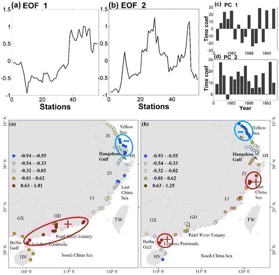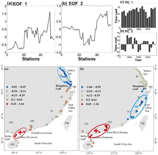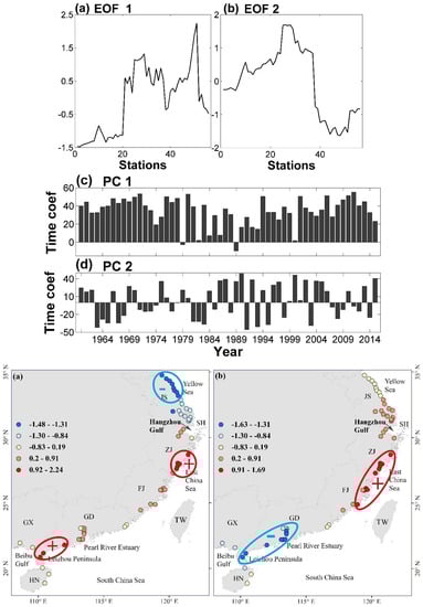 The above results are evaluated as the basic spatiotemporal distribution of long-term storm surge threat along the entire southeastern coastline of China. Here, we use the EOF function to analyze the evolution pattern of the annual-sum ASPI in individual tide-gauge stations from 1960 to 2015. The principal components of spatial distribution and temporal fluctuation pattern can evaluate the evolution of storm surge threat along the southeastern coastline of China.
