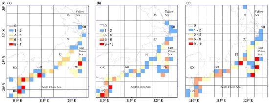 The spatial distribution grid of TC landfall positions in (a) 1960–1978, (b) 1979–1994, and (c) 1995–2016.