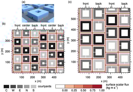 The highest scalar concentrations can be observed within the street canyons (Figure 4). The largest values occur near the surface and the leeward walls of the canyon, according to the observed pattern in previous studies [12,37], as it becomes most obvious downstream of “C back” (Figure 4c), where the re-circulation can catch up more scalar along the x-parallel street canyon compared to the re-circulations downstream of “C front” or “C center” (compare Figure 4a,b and Figure 6a). Within the closed-courtyard cavities, the concentrations are significantly lower compared to those within the street canyons, with values slightly lower than , while no significant differences can be observed among the front-, center-, and back-row courtyards.