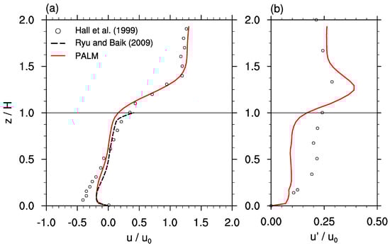 Vertical profiles of normalized (a) u-component of the wind and (b) its standard deviation at the center of the courtyard. The red curve shows the profiles simulated by PALM, the black curve the simulated data by Ryu and Baik [9], and the dots data from the wind-tunnel experiments by Hall et al. [2]. represents the mean oncoming wind speed at (height marked by horizontal line). The PALM profiles are time-averaged over 3 .
