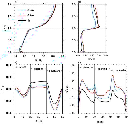Vertical profiles of normalized (a) u-component of the wind and (b) its standard deviation at the center of the courtyard, as well as horizontal profiles of (c) u and (d) along the center line of the courtyard opening for different grid sizes. represents the mean oncoming wind speed at (height marked by horizontal line). Profiles are time-averaged over 3 .
