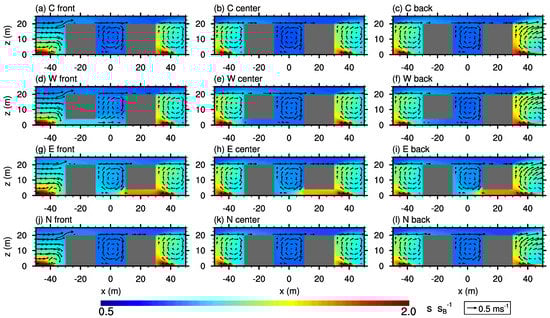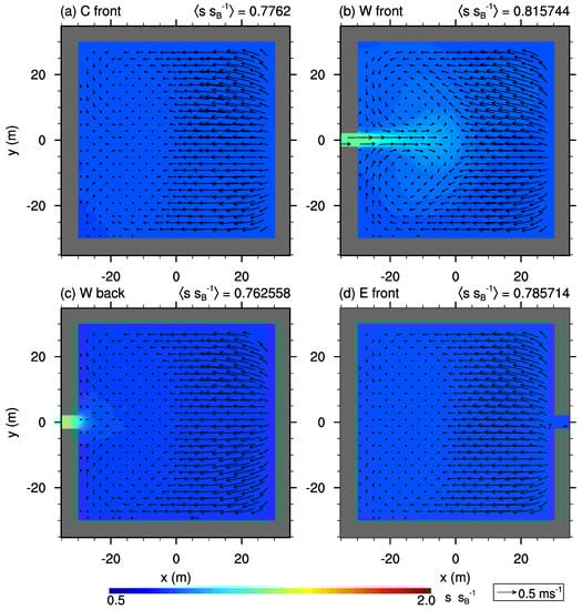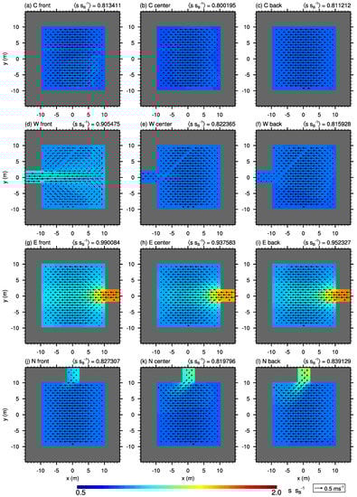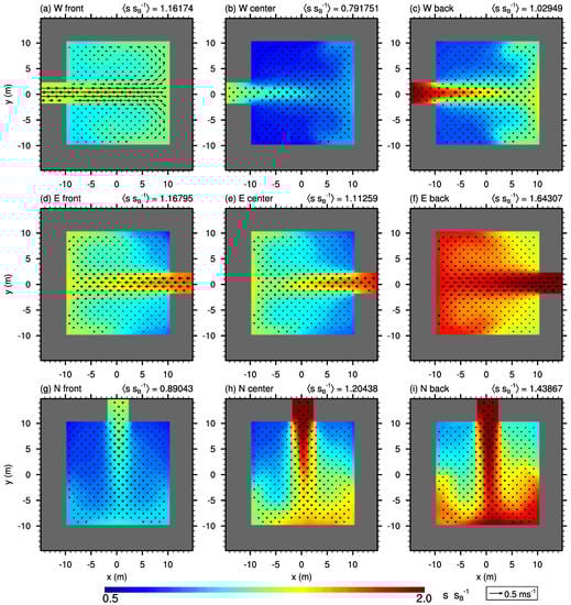 If the opening is located at the northern wall, the x-parallel street-canyon flow slightly pushes polluted air into the courtyard (cf. Figure 5j–l). The strength of this mean inflow as well as the scalar concentration within and near the lateral opening increases from the front row to the back row. However, it does not significantly affect the mean flow pattern within the rest of the courtyard and the re-circulation is quite similar to that of a closed courtyard (cf. Figure 4j–l). The concentration is about the same or slightly higher within these courtyards compared to the closed ones as well as “W center” and “W back”, but it is well below the levels of courtyard “W front” and those with openings at the eastward wall. Please note, due to symmetry, results for courtyards with openings located at the northern wall are similar to those with openings at the southern wall.