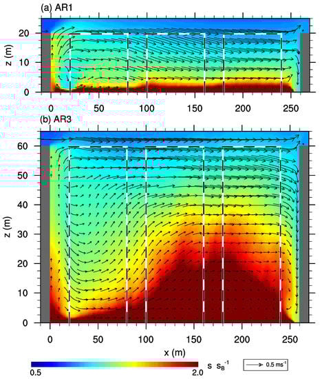 -cross-section of the mean flow field (vector arrows) and scalar concentration (contours) along the center of an x-parallel street for case (a) AR1 and (b) AR3. Scalar concentration is normalized with the background concentration at . The black-and-white lines indicate the positions of the buildings along the street.