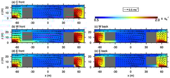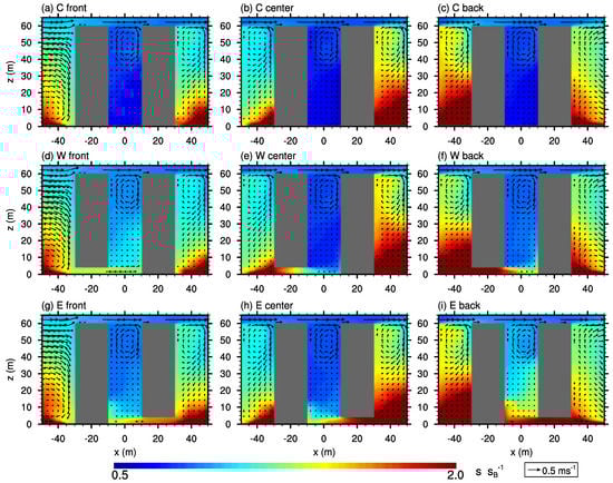 Figure 7 shows vertical cross-sections for the high aspect ratio case AR3, where courtyards as well as the street canyons are three times deeper compared to AR1 (ref. Table 1). The re-circulation within the courtyard cavities does not extent throughout the entire cavity but occurs only within the upper part. Close to the surface, a weak secondary counter-rotating circulation is present, similar to the findings described in, e.g., Hall et al. [2] and Assimakopoulos et al. [12] (see Figure 7a–c). Similar to case AR1, the non-blocked oncoming flow along the x-parallel street canyon upstream of the front row causes a small eddy close to the surface at the windward building wall, where also air from the upper part of the street canyon is transported downwards (see Figure 7a). Likewise, downstream of the back row, a re-circulation downstream of the building can be observed. The street-canyon flow between the center and back row shows a comparable pattern as within the courtyard cavity. Between the front- and center-row building (see Figure 7b), it strikes that the street-canyon flow exhibits a vertical component which extends down to the surface, which might be linked to the flow along the x-parallel street canyon.