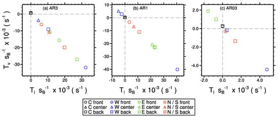Figure 11 shows the time-averaged net transport of scalar into the courtyard volume by the lateral and the vertical opening for the different courtyard realizations. Positive values indicate increasing scalar concentrations within the courtyard and vice versa. As expected, the closed courtyards (black symbols) show slightly positive net transport through the top opening, which indicates slightly increasing concentration within the courtyard cavity during the analysis period. For all ARs, the highest net transport by the lateral opening can be observed for the “W front” courtyards (blue circle, Figure 11), attributed to the non-blocked incoming flow. At this point, we want to emphasize that a high net transport into the courtyard does not necessarily correlate with high scalar concentrations. This becomes obvious for “W front” and “E back” in case AR3 (blue circle and green square, Figure 11a), where “W front” exhibits higher net transport than “E back” but shows lower mean concentration (see also Figure 8a,f). This is because the high net transport through the lateral opening for “W front” is relatively quickly compensated by the vertical transport across the top opening, while for “E back”, the entrained scalar resides for a longer time within the courtyard leading to higher mean concentrations.