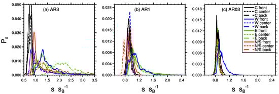 The previous analysis revealed that mean scalar concentrations within the courtyard cavities are lower compared to the adjacent street canyons. To estimate the impact on human health, however, the exposure to high concentrations and their relative occurrence are also relevant. To investigate whether lateral openings promote the occurrence of high concentrations within courtyards, we calculated PDFs from the sampled scalar concentrations at the courtyard center at a height of (representative for human exposure). Figure 12 shows the PDFs for the different ARs and courtyard setups. Among the different ARs, the closed courtyards (black curves) show similar PDFs with quite narrow Gaussian-shaped distributions and median values below the background concentration, indicating that almost no high concentrations are mixed from the top into the courtyard. For case AR03 (Figure 12c), almost all courtyard geometries show PDFs which are quite similar to the closed-courtyard PDFs. Only the “W front” courtyard (solid blue curve) shows a slightly skewed PDF where scalar concentrations reach values up to 1.5 times the background concentration, which is due to the direct inflow of scalar-rich air from the street canyon through the lateral opening. Similarly skewed PDFs can be observed for the “W front” courtyards in case AR3 and AR1 (Figure 12a,b).