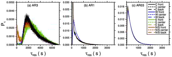 Probability density functions of particle residence times within the courtyard volume, for (a) case AR3, (b) AR1, and (c) case AR03.