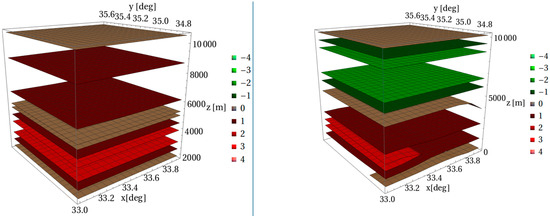 Figure 2 shows 3D contour plots of 1° × 1° ECMWF vertical wind data for each of the radiosonde observation times: 06:00 UTC and12:00 UTC 17 April 2013. The legend colors correspond to the range of values of . One notable characteristic of these plots is the apparent uniformity of air speeds at various height levels. This uniformity removes any significant dependence on region’s window size, as long as a minimum window of 0.2° × 0.2° is used. A maximum window of 1° × 1° is likely to provide minimum variation at the horizontal levels. All of the variation is in the vertical direction. This appears to be true at the 1 deg × 1 deg scale and smaller. Note that because of the spacing of ECMWF grid points, microscale features are not likely to show up.