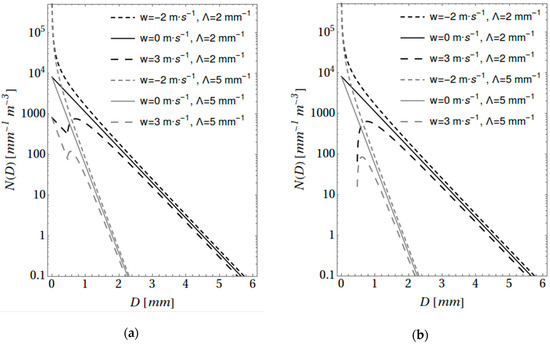 FCM-DSD with downdraft, still air, and updraft examples, with: (a) = 8000 (mm−1 m−3), = 0.9, and = 0; (b) = 8000 (mm−1 m−3), = 1, and = 0.