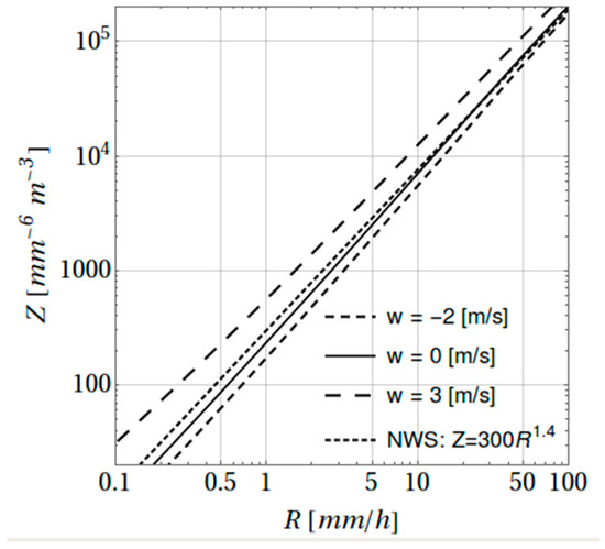 Employing disdrometer DSD data to estimate the vertical air velocity has been approached in different ways, depending on the nature of the disdrometer. The method discussed in this current work is based on a procedure presented in previous work [21], using impact disdrometer data. In this case, the disdrometer extracted A-b coefficients, where Z = ARb, seem to be influenced by the magnitude of and especially the sign. In a more recent work, Kim and Song [22] have compared measured by a three-axis ultrasonic anemometer and by a collocated laser disdrometer. The considered by Kim and Song [22] is not the same considered by Lane et al. [21] and in this current paper. In the present work, is an average value from the surface to a reference height of zref = 10 km. In the work by Kim and Song [22], is the value measured at the surface. On a flat surface, should be zero, but because Kim and Song studied areas near mountain slopes, the vertical component of air motion at the surface can be non-zero.