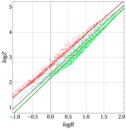 A parametric plot of Z versus R over a range of with a fixed generates nearly straight lines on a log–log plot, (as discussed below in conjunction with Figure 7). This inherent property of nearly straight lines is the source and motivation for expressing
