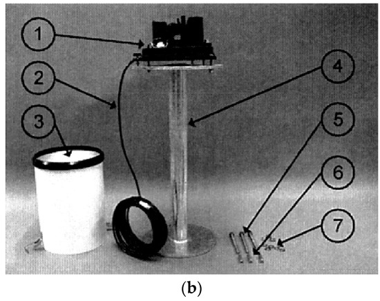 (a) Lefkosa rain gauge station; (b) Rain gauge with the installation equipment. The following numbers refer to the installation equipment of rain gauge: 1 = Sensor base; 2 = Sensor cable; 3 = Outer tube; 4 = Stand; 5 = Mounting bolts for the stand; 6 = Wedge bolts; 7 = Nut and washers for mounting bolts.