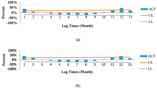 Correlogram of precipitation time series for (a) Ercan station; (b) Lefkoşa station. UL = Upper Limit; LL = Lower Limit.