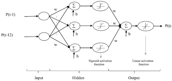 In this study, the input layer consisted of combinations of P(t−1), P(t−12) and the target was P(t) as shown in Figure 5. Both the architecture (the number of neurons, number of layers, transfer function) and learning rate is usually determined using the trial-and error process. The sigmoid activation function was employed for input and hidden layers while in the output layer, a linear function was applied in the used FFNN models [53]. The developed ANN structure is illustrated by Figure 5.