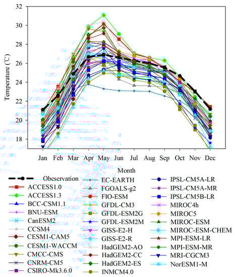 Variation of the observed temperature and GCMs of the mean annual cycle during the reference period 1961–2004 over the LMB.