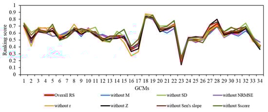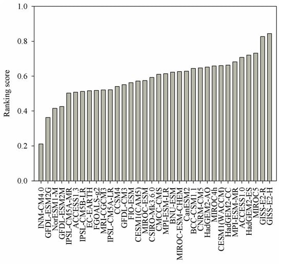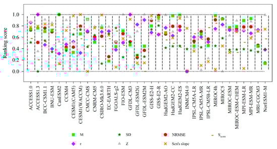 Ranking scores of the seven criteria of the GCMs are shown in Figure 3, which were calculated based on the criteria statistics. Overall ranking scores of the GCMs are shown in Figure 4, which were calculated based on the ranking scores of the eight criteria. For a set of different criteria, a GCM may perform well for one criterion but badly for another. For example, CanESM2 had the highest ranking score value of 1 based on the M but the low ranking score value at 0.14 for the Sen’s slope. Although GFDL-ESM2M had the lowest ranking score value at 0 by Sscore, it had the highest ranking score value at 1 by Z. For the overall ranking scores of the GCMs, a GCM may perform well for one or two criteria but badly for the overall result. For example, ACCESS1.3 had the highest ranking score value at 1 by r but low overall ranking scores at 0.51. Although INMCM4.0 had high ranking score value at 0.92 by Z, it had the lowest ranking score value at 0.21 for the overall result. This indicated that the results of GCMs performance relied mainly on the assessment of the criterion. Thus, using multiple criteria to comprehensively assess the performance of GCMs is essential.