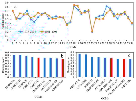 Comparison of overall ranking scores of GCMs under reference periods of 1975–2004 and 1961–2004 (a) and top 25% ranking scores of GCMs under reference period of 1975–2004 (b) and 1961–2004 (c), respectively. The numbers on the x-axis (a) represent the ID numbers in Table 1.