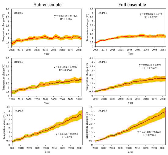 Here and represent mean temperature for month i of the projections of 44 years in the future and the historical MME outputs of the reference period of 1961–2004, respectively. We focused on two 44 years of 2006–2049 and 2050–2093 under RCP2.6, RCP4.5, and RCP8.5 scenarios for the projection of future temperature changes.