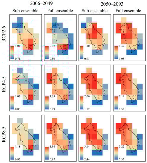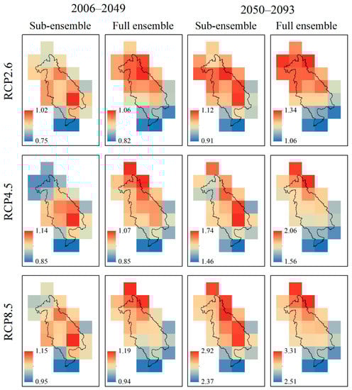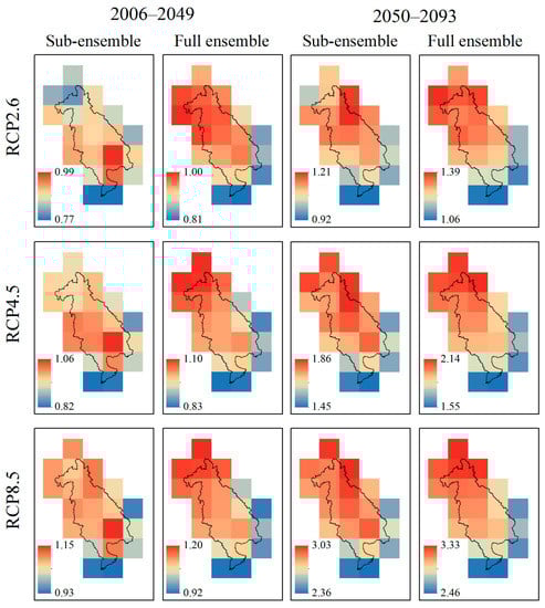 Future temperature change under RCP2.6, RCP4.5, and RCP8.5 scenarios of all 21 grids over the LMB are shown in Figure 8, Figure 9, Figure 10, Figure 11 and Figure 12. It is projected that the temperature will increase over the LMB. The projected mean annual temperature increase from the far future (2050–2093) showed significantly higher than the near future (2006–2049), and the projection by the full ensemble showed higher temperature increase than the sub-ensemble, with the values range from 1.06 °C to 1.39 °C, 1.55 °C to 2.14 °C, and 2.46 °C to 3.33 °C for the far future (2050–2093) and 0.81 °C to 1.00 °C, 0.83 °C to 1.10 °C, 0.92 °C to 1.20 °C for the near future (2006–2049) by the full ensemble, while range from 0.92 °C to 1.21 °C, 1.45 °C to 1.86 °C, and 2.36 °C to 3.03 °C for the far future (2050–2093) and 0.77 °C to 0.99 °C, 0.82 °C to 1.06 °C, and 0.93 °C to 1.15 °C for the near future (2006–2049) by the sub-ensemble, relative to the reference period of 1961–2004 under RCP2.6, RCP4.5, and RCP8.5 scenarios, respectively. On the whole, the distributions of the mean annual temperature change showed relatively similar spatial distributions between the near future (2006–2049) and the far future (2050–2093) under projections from the sub-ensemble and the full ensemble, showing that the higher warming mainly occurred in the northern and central areas of the LMB, while the lower warming mainly occurred in the southeast and the southwest, especially under the RCP4.5 and RCP8.5 scenarios. Moreover, the warming for individual grid increased as the RCP increased for the sub-ensemble and the full ensemble. For the seasonal change, the similar spatial patterns of temperature changes were also found in the MAM, JJA (June–July–August), SON (September–October–November), and DJF, but the MAM warming showed relatively higher in comparison with other seasonal warming.