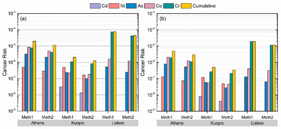 At the end, the cumulative cancer risk (both adults and children) in all three cities and for both methodologies was lower than the acceptable limit 10−4 [38,41] as shown in Figure 1. Herein, the cancer risk was estimated considering only inhalation, whilst, the exposure to metals occurs also via ingestion and dermal contact. Therefore, the cumulative cancer risk is expected to be higher if ingestion and dermal contact are considered [13]. This observation is reported in Megido et al. [52] where the cumulative cancer risk via ingestion was higher than 10−4 at an industrial suburban station in Asturias (Spain).