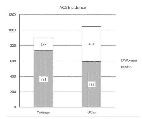 Our sample is in line with European Cardiovascular Disease Statistics. For younger populations, ACS tendency was observed to occur three to four times more often in men than in women; in older populations, ACS incidence is greatly increased in women [1,10].