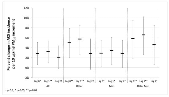 This is the first study that examines the immediate and delayed effects of PM10 concentrations on the incidence of ACS for age- and gender-specific population groups. Our study detected the presence of the “rise and fall” lag pattern in PM10-related ACS incidences observed in three population groups (older than 65, men, and men older than 65) with one-day lag having the strongest effect. The results also show that the most susceptible group are men older than 65 while no significant association was detected for women and younger populations.