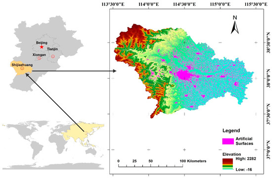 Geographical location, topography, and artificial surfaces of Shijiazhuang.
