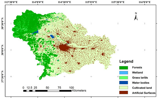 The types of land cover in Shijiazhuang are roughly divided into forest, wetland, grassland, water body, cultivated land, and artificial surfaces [32], Figure 3. According to the influence of vegetation on the soil, resistance of land cover types to precipitation giving rise to disasters is getting weaker and weaker according to the order of forest, grassland, cultivated land, artificial surfaces, wetlands, and water bodies. Expert scoring and AHP methods are used to determine the resistance of various factors on precipitation.